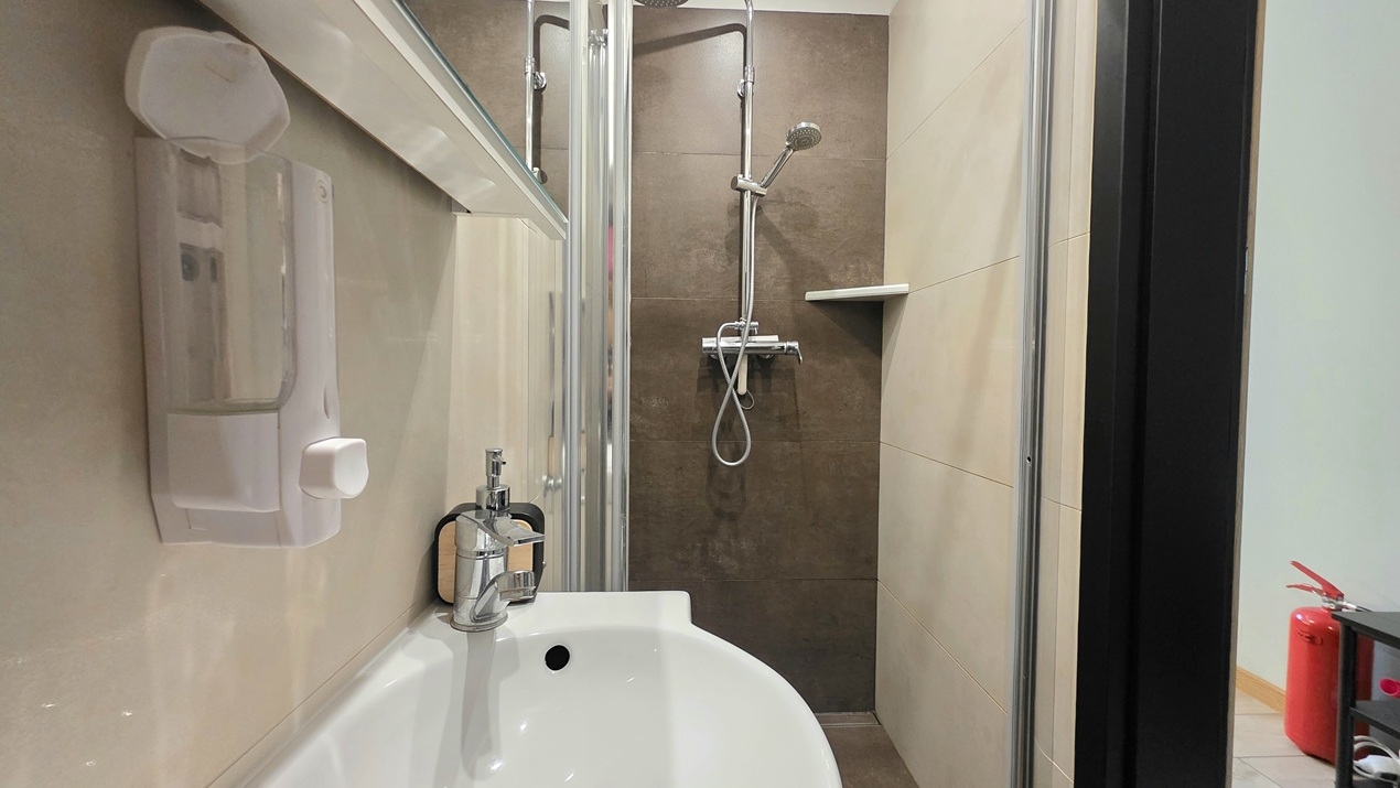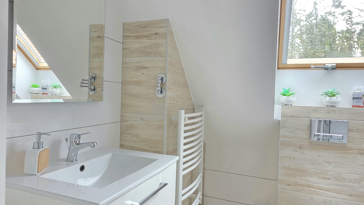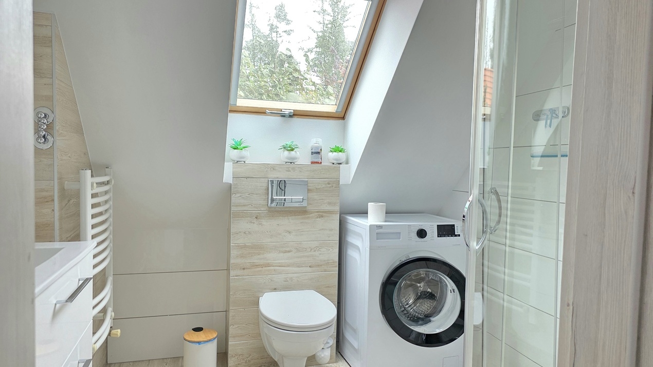 - Łazienka z wc i prysznicem, pralka, drewniane okno typu velux.