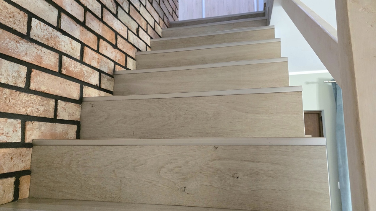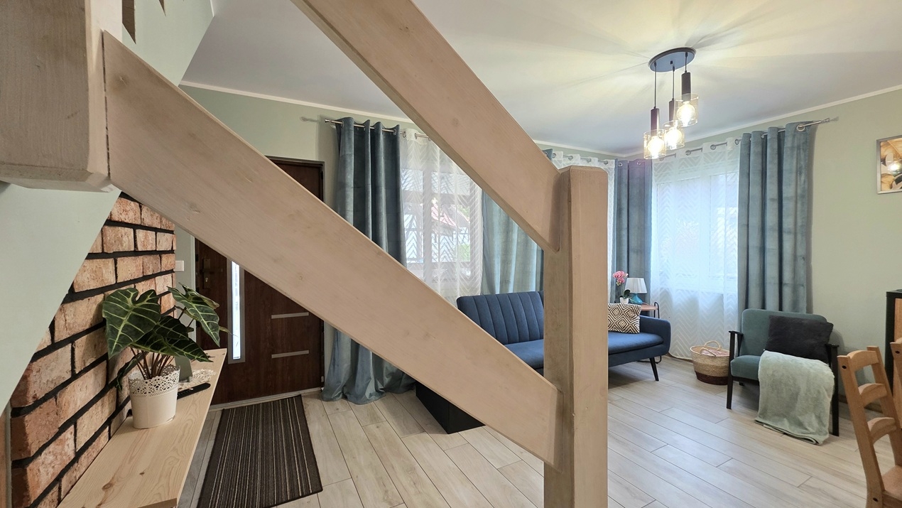 Na piętro prowadzą schody z drewnianą poręczą i naturalną cegłą na ścianie. Tu mieszczą się: