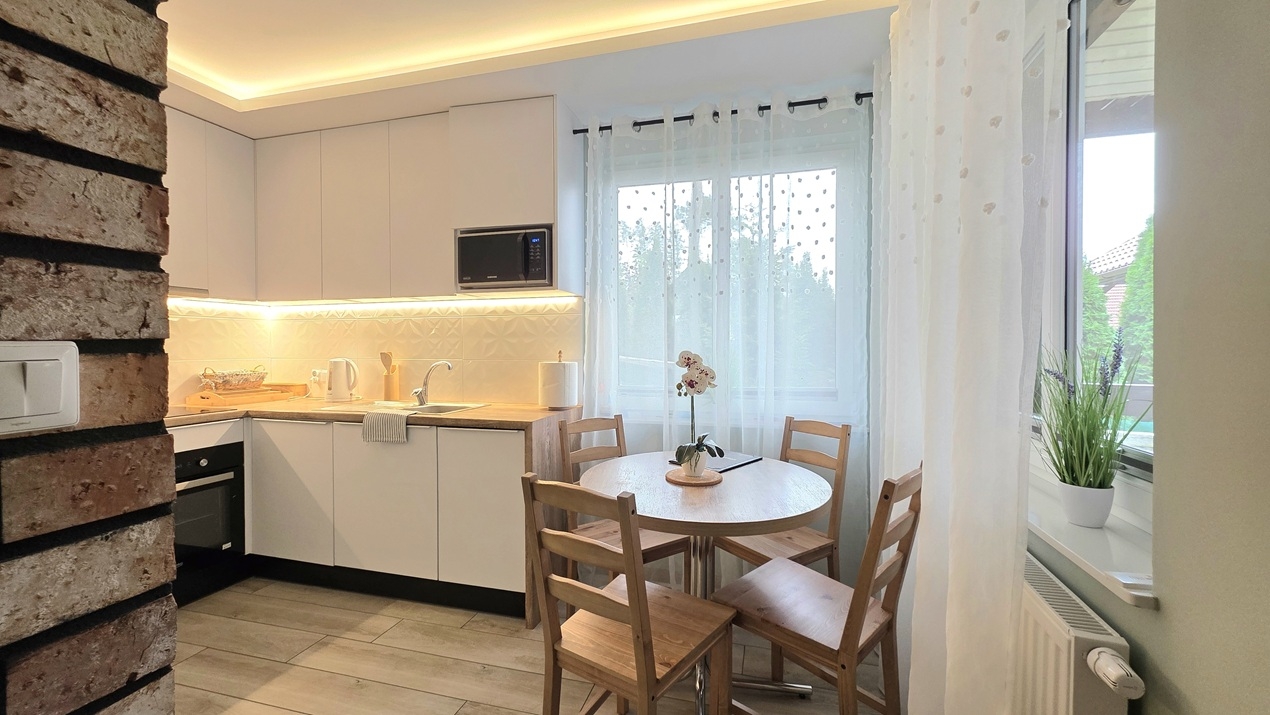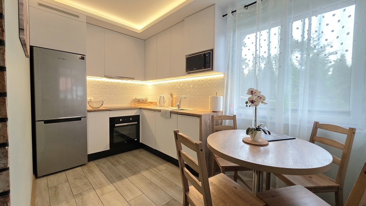 - oddzielna kuchnia, wyposażona w wolnostojącą lodówko-zamrażarkę oraz zmywarkę, mikrofalówkę, kuchnię indukcyjną, piekarnik- wszystko w zabudowie kuchennej