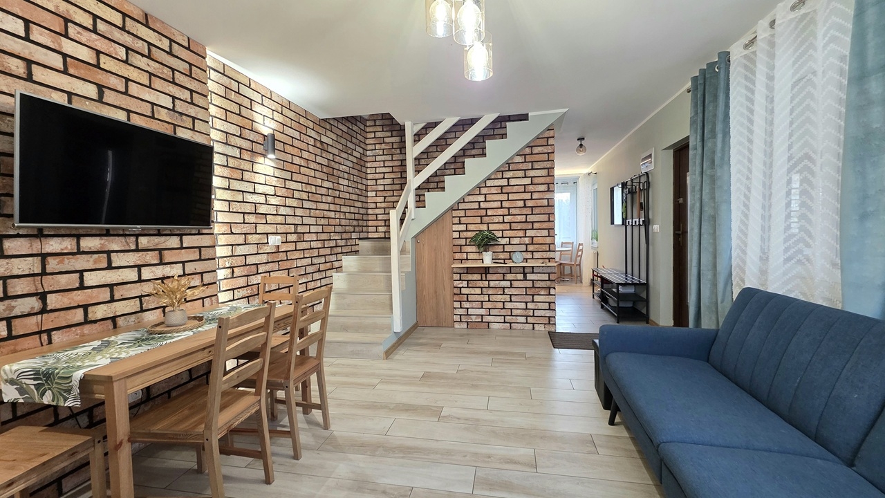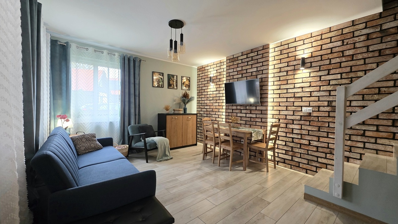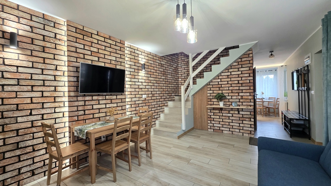 - przytulny salon o powierzchni około 18 m2 z trzema oknami od południowego zachodu, ze ścianą z naturalnej cegły, wyposażony w wygodną kanapę, telewizor, komody