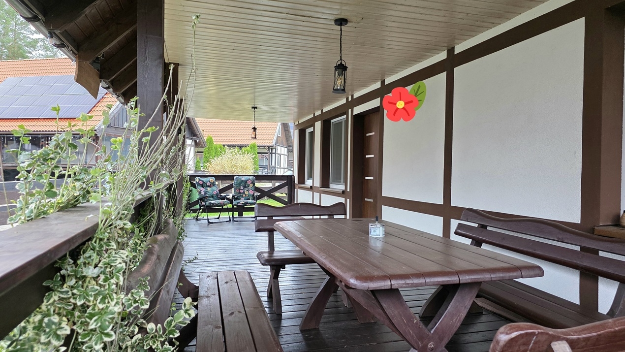 Tuż przy wejściu do budynku jest duży, około 27 m2 zadaszony taras, wspaniały na odpoczynek czy letnie biesiadowanie z dala od zgiełku miasta.