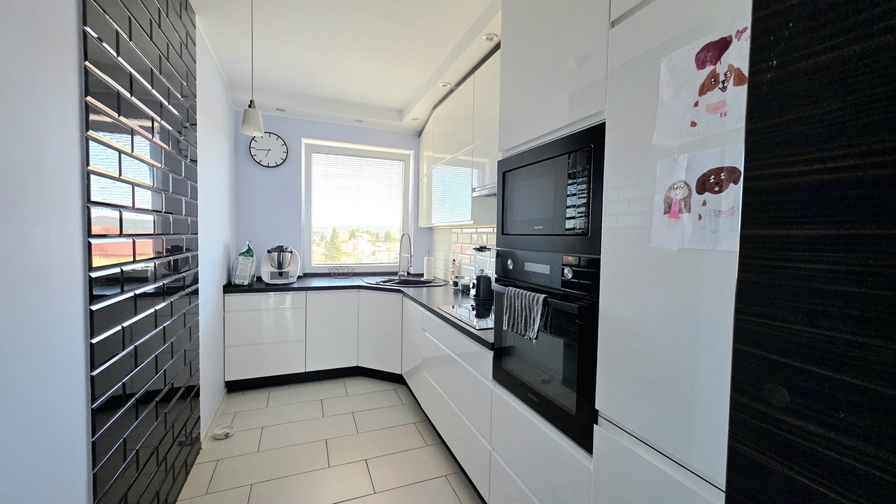 - oddzielna, przestronna kuchnia z oknem, wyposażona w sprawne sprzęty: mikrofalę, piekarnik, pralkę, zmywarkę, lodówko-zamrażarkę,